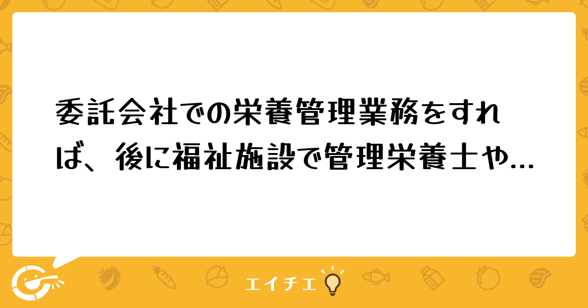 ・「施設へ管理栄養士を派遣させる→その為事実上、施設の直営の管理栄養士と同等の働き方となる」と面接時に説明を受けたのですが、この場合は後に経験を3〜5年程積んだ時に、直営での福祉施設への転職は可能でしょうか?(転職サイトの方からは、福祉施設での栄養管理業務をしたとカウントされるとは言われましたが)