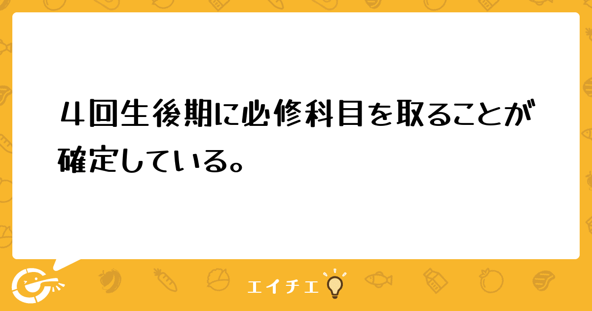 ①4年生の後期で必修科目を履修することはどれくらいの危険なことなのか(落としてしまったら留年確定なので)2回生からは難なく単位を取得できているので普通に勉強すれば取れると思います。ですが留年がかかっているということもあり非常に不安です。今の段階で既に不安すぎて寝れなくなるほどです。