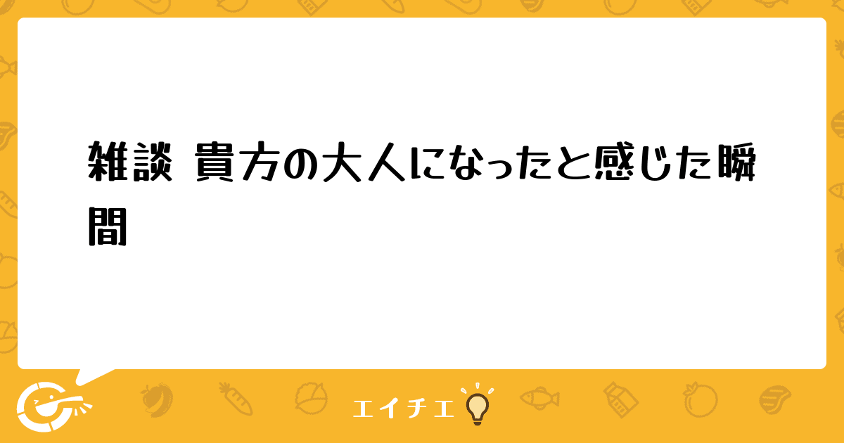 おはようございます。下らない質問を読んで頂きありがとうございます。 貴方が、大人になったなと感じた瞬間や更にその上の年取ったと感じた瞬間は、どんな時ですか? 自分は、大人になったと感じた時は10代や20代前半の子らの馬鹿騒ぎを冷ややかに見ていた時です。また年取ったと感じたのは、最近平日のラジオゆ○ゆ○ワイドを普通に聞きながら家の事してる自分にビックリしました。(笑)稚拙な文章最後まで読んで頂きありがとうございました。