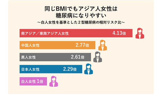 人種・民族とBMIの組み合わせによる検討では、白人でBMIが18.5~22.9の女性を基準とすると、同じBMIカテゴリの女性において、南アジア/東南アジア女性では5.08倍、黒人女性では4.83倍、中国人女性で4.10倍、日本人女性で3.03倍と、標準体型とされるBMIの範囲内でも2型糖尿病発症リスクが高いことが判明した。