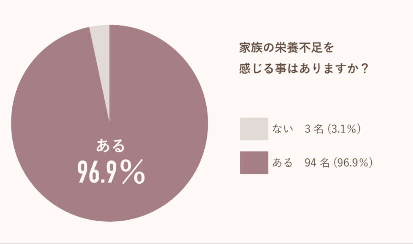 続いて、家族の栄養不足を感じることがあるかという問いには、「ある」が94人(96.9%)でこちらも大半を占めた。「ない」は3人(3.1%)とごくわずかにとどまっている。自身の栄養状態だけでなく、家族全体の栄養バランスへ意識を向けている一方、それがうまく実現できていない、対応として不十分と悩んでいる人が多いようだ。