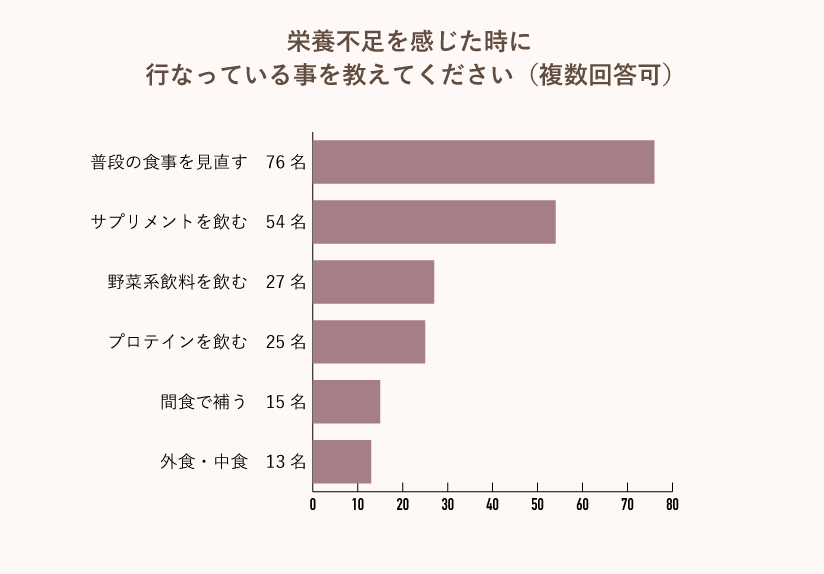 栄養不足を感じた時に行っていることを複数回答可で尋ねると、1位は「普段の食事を見直す」の76人(78.4%)となり、2位が「サプリメントを飲む」の54人(55.7%)、3位は「野菜系飲料を飲む」の27人(27.8%)、4位には「プロテインを飲む」の25人(25.8%)がランクインした。