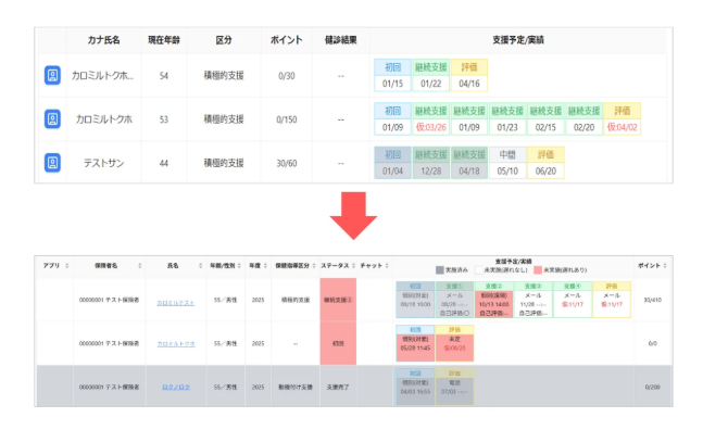 支援担当者・保険者・面談時期などの要素による絞り込みも可能で、エクセルなどによる別ソフトでの進捗管理を不要としている。