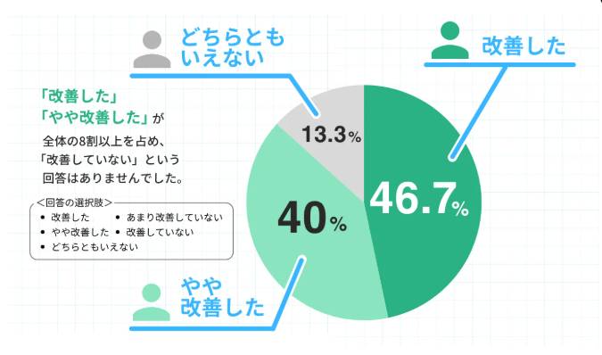 ライフログテクノロジーが8月に実施したアンケートでは、「カロミル保健指導」利用中の指導機関のうち、46.7%が業務効率が「改善した」、40%が「やや改善した」と回答、合計86.7%で一定以上の改善が確認されている。