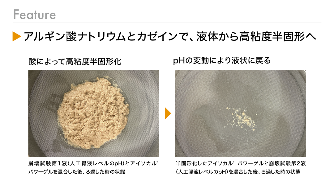 液体から高粘度の半固形状へと変化するのは、アルギン酸ナトリウムとカゼインを含んでいるから。人工胃液レベルのpHでは半固形化するが、人工腸液レベルのpHになると、液状に戻る。