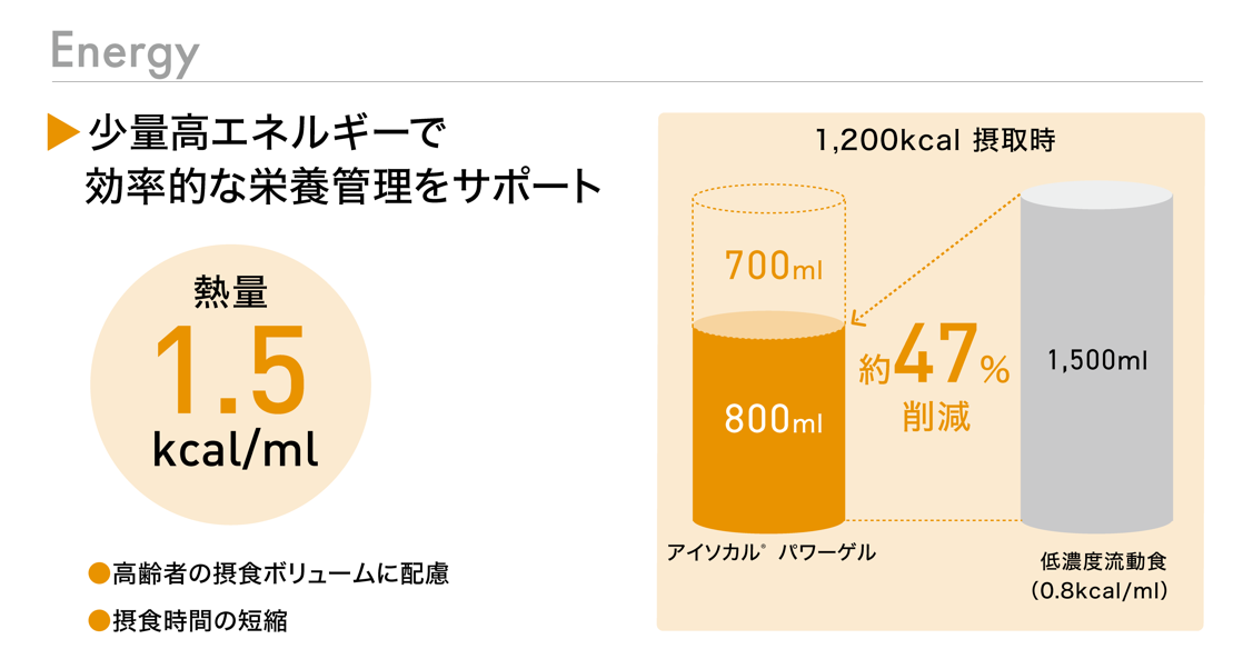 少量でもエネルギーを十分に摂取でき、日々の効率的な栄養管理がサポートされる点も特徴となる。