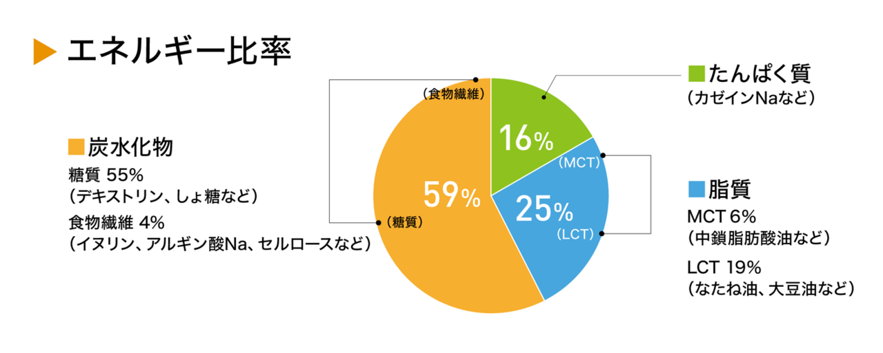 エネルギー比率のバランスも十分に考慮されており、デキストリンやしょ糖などの糖質が55%、イヌリンやアルギン酸ナトリウム、セルロースなどの食物繊維が4%で、炭水化物が合計59%を占めるほか、たんぱく質は16%、脂質は25%で中鎖脂肪酸油などMCTが6%、菜種油や大豆油などのLCTが19%となっている。