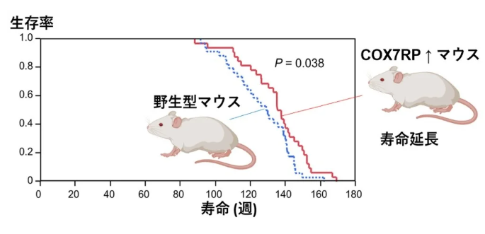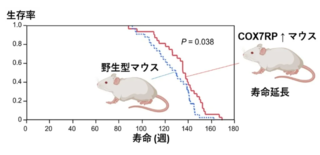 研究グループでは、超複合体の形成を促進するたんぱく質であるCOX7RPに着目し、その過剰発現がマウスの寿命や加齢性変化にどのような影響を与えるか解析を行った。