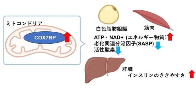 一方で、白色脂肪や筋肉ではSASPと呼ばれる老化に関わる物質が減少し、老化の原因とされる活性酸素も減少していた。