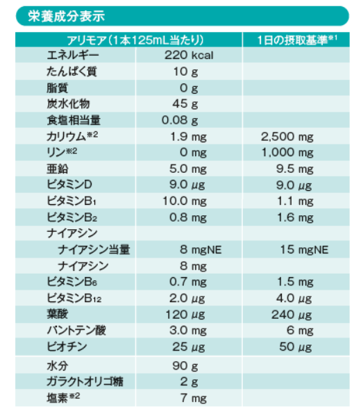 「アリモア(スイートシトラス風味)」は、1本125mLで、エネルギー220kcal、たんぱく質10gを摂取できるクリアタイプの飲料。商品名は、少しでも多く(「a little more」)栄養を摂取してほしいという想いを込めて名づけられた。