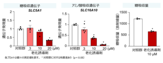 正常なヒト小腸オルガノイドと、細胞老化モデルヒト小腸オルガノイドにおいて、栄養素吸収に関わる遺伝子発現量比較を行ったところ、細胞老化の誘導により、糖の吸収に関わる遺伝子であるSLC5A1、アミノ酸吸収に関わる遺伝子のSLC16A10の発現量が減少していることが判明した。