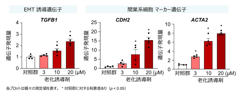 今回、単層培養したヒト小腸オルガノイドに、まず老化誘導剤として抗がん剤の一種であるシスプラチンを処理、細胞老化を誘導した。その上で、糖やアミノ酸などの栄養素吸収に関わる遺伝子発現量、EMTに関わる遺伝子発現量などを定量的PCR法で評価した。