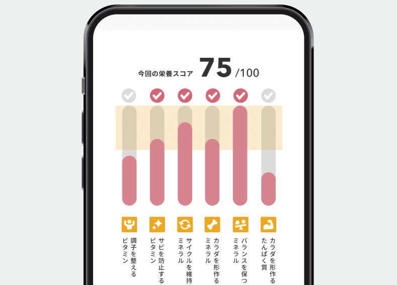 栄養スコアは、ビタミン、ミネラル、たんぱく質の役割に基づき、6項目で評価され、結果が分かりやすい可視化グラフで示されるという。
