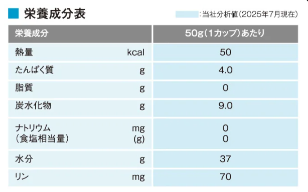 冷凍庫で凍らせてアイスとして提供すると、冷たさとやさしい口当たりにより、無理なく体に必要な栄養を届けられる。1カップ50gあたりエネルギーは50kcal、ホエイプロテイン4.0gを配合する。