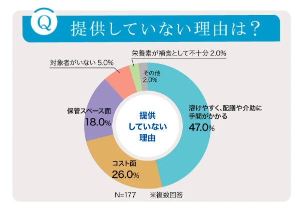 医療・介護現場に勤務する465人の管理栄養士・栄養士を対象に、ネスレ ヘルスサイエンスが「給食用アイスに関する課題」についてのアンケート調査を実施したところ、アイスを提供したことがないのは177人で、その理由としては、「溶けやすく、配膳や介助に手間がかかる」が47.0%で圧倒的に多かった。