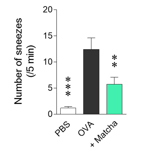 抹茶を飲用することによって、アレルギー性鼻炎の発症や病態に関わる免疫応答は影響を受けないものの、くしゃみ反射関連神経に作用し、その反応が減弱する可能性が明らかとなった。