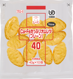 また、給食現場では調理工程が簡単で、設備環境に配慮した商品が求められるが、「スノーマンCa・Feたっぷりオムレツ」シリーズは10個が1袋に入ったタイプと、100個入りのバラタイプがあり、さらにそれぞれ1個あたり40gタイプと60gタイプのサイズ違いがある。メニューバランスや調理現場オペレーションにあわせて使い分けやすく、ニーズに柔軟に応える仕様が特徴だ。