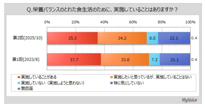 栄養バランスのとれた食生活のために実施していることはあるか、全員に尋ねると、「実施していることがある」は35.3%で、全体の約3分の1になった。「実施したいと思っているが、実施していることはない」の回答者がこれに続いて多い34.2%で、「実施していない(実施しようと思わない)」は8.0%、「とくに気にしていない」が22.1%だった。