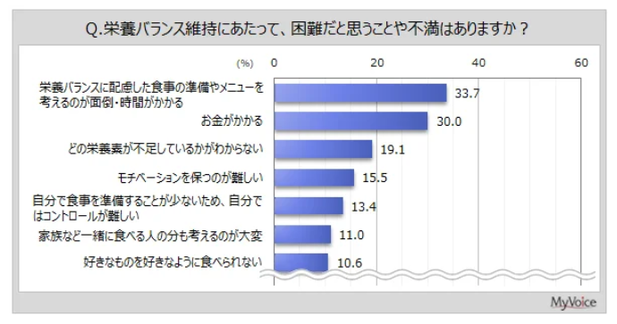 次いで「お金がかかる」の30.0%、3位が「どの栄養素が不足しているかが分からない」の19.1%、4位は「モチベーションを保つのが難しい」の15.5%、5位に「自分で食事を準備することが少ないため、自分ではコントロールが難しい」の13.4%などとなっている。