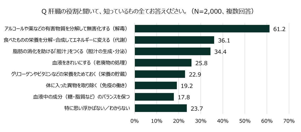 「特に思い浮かばない、分からない」とした人も23.7%にのぼる。アルコール分解のイメージは広く持たれているが、代謝や免疫、栄養貯蔵などの役割を果たしていることを知っている人は限られるようだ。