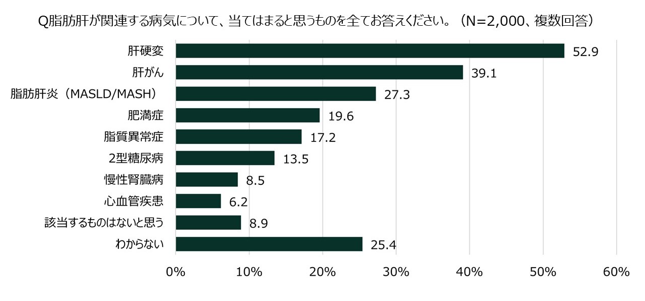 続いて脂肪肝が関連する病気について、当てはまると思うものを選んでもらうと、「肝硬変」は52.9%と過半になったが、以下は半数に満たず、「肝がん」で39.1%、「脂肪肝炎」が27.3%、「肥満症」は19.6%、「脂質異常症」で17.2%、「2型糖尿病」は13.5%、「慢性腎臓病」は8.5%、「心血管疾患」は6.2%だった。