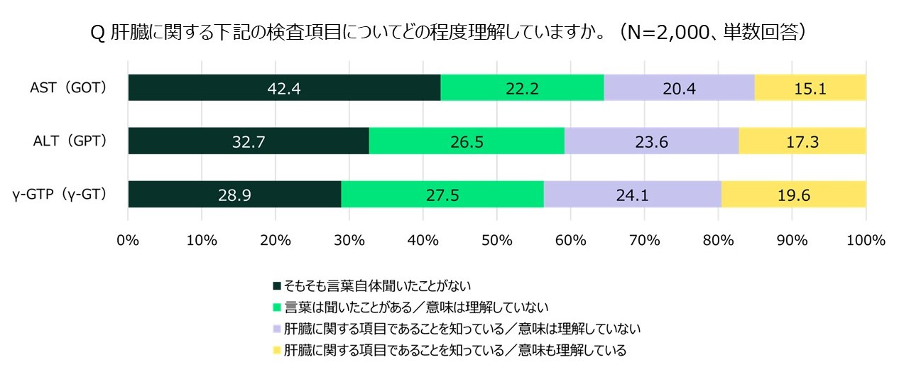 「そもそも言葉自体聞いたことがない」とした人も、ASTで42.4%、ALTで32.7%、γ-GTPで28.9%と約3~4割にのぼった。