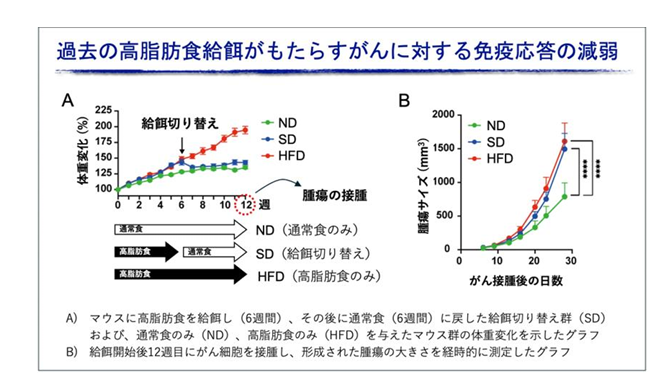 また通常食のみを与えたND群、高脂肪食のみを与えたHFD群も設け、それぞれのマウスに腫瘍を摂取してがん免疫応答を比較、代謝ストレスが時間経過とともにどのように免疫系へ持続的影響を及ぼしていくのかを解析した。