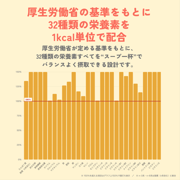 「Me SOUP」は、厚生労働省が定める「日本人の食事摂取基準(2025年版)」に基づき、1食あたり32種類の栄養素をバランス良く配合。ビタミンやミネラル、たんぱく質、食物繊維など、多様な栄養素すべてを1杯のスープで効率良く摂れるようにした。