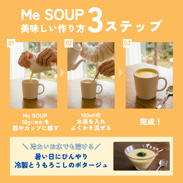 今回、さらにラインアップを拡大させ、温かなものも食べさせてあげたいという現場の声に応えるかたちで、「Me SOUP」の開発・販売開始となった。