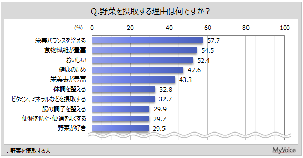 4位は「健康のため」の47.6%、5位に「栄養素が豊富」の43.3%、6位「体調を整える」の32.8%、7位「ビタミン、ミネラルなどを摂取する」の32.7%、8位は「腸の調子を整える」の29.9%、9位「便秘を防ぐ、便通をよくする」の29.7%、10位「野菜が好き」29.5%などとなっている。