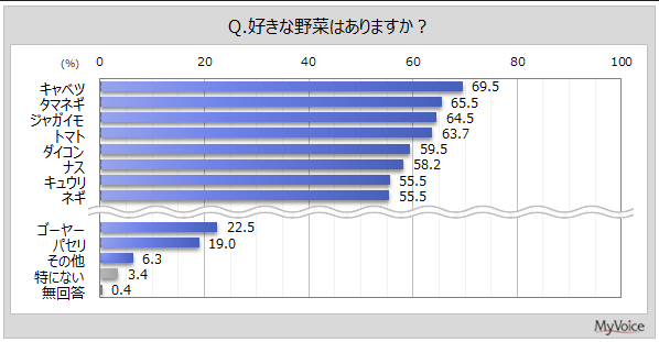 野菜の中で好きなものを複数回答可で尋ねると、「キャベツ」が69.5%で最多、2位は「タマネギ」の65.5%、3位「ジャガイモ」の64.5%、4位「トマト」で63.7%、5位は「大根」の59.5%、6位「ナス」58.2%、7位に「キュウリ」と「ネギ」の55.5%などとなった。