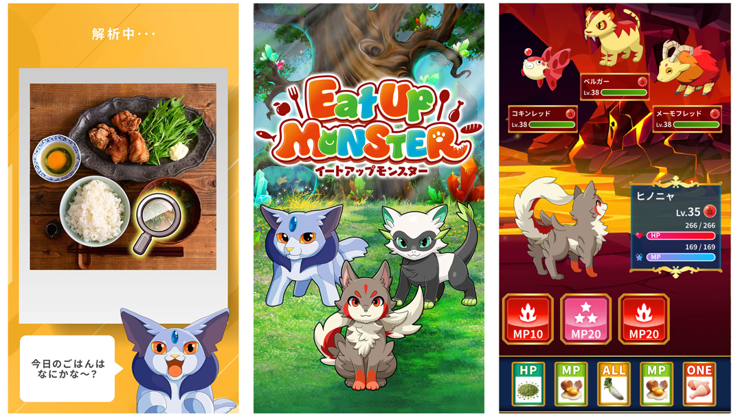 ユーザーの食事写真をAI解析し、その料理に含まれる食材をモンスターが食べると、バトルで使える「食材カード」が排出される。食材が多いほど、バラエティに富んでいるほど、保有カード数も増え、ゲームを有利に進められるようになるため、栄養バランスを意識することがポイントになる。