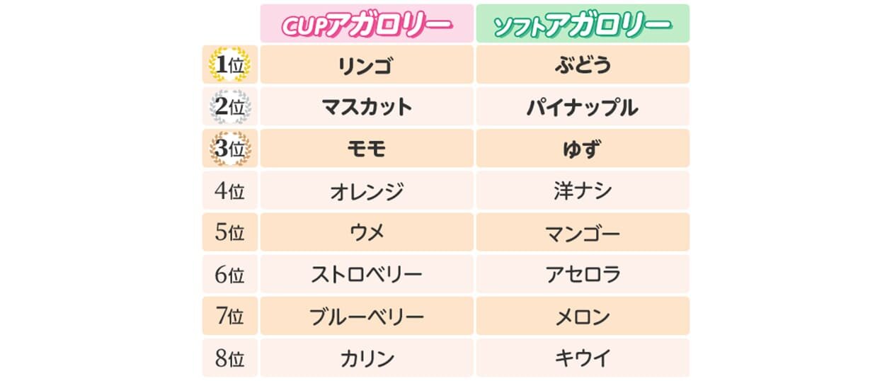 全部で16種類の味がある「カップアガロリー」と「ソフトアガロリー」。人気の味を予想して投票してもらったところ、このような結果となりました。味を選ぶ参考にしてみて下さい。