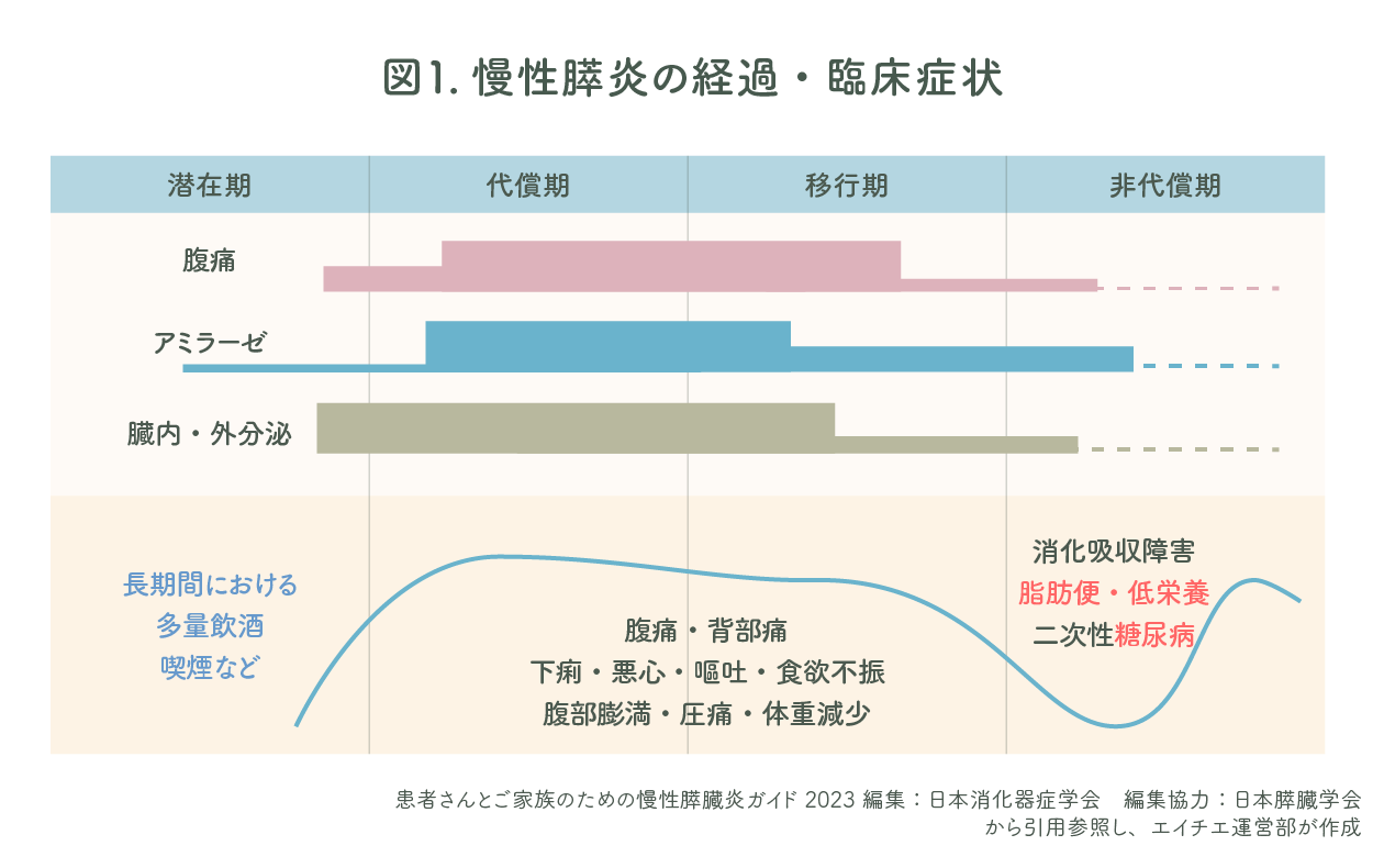 慢性膵炎の食・栄養管理は病期の臨床症状や、膵臓の機能の残存状態応じて行います。(図1.参照)