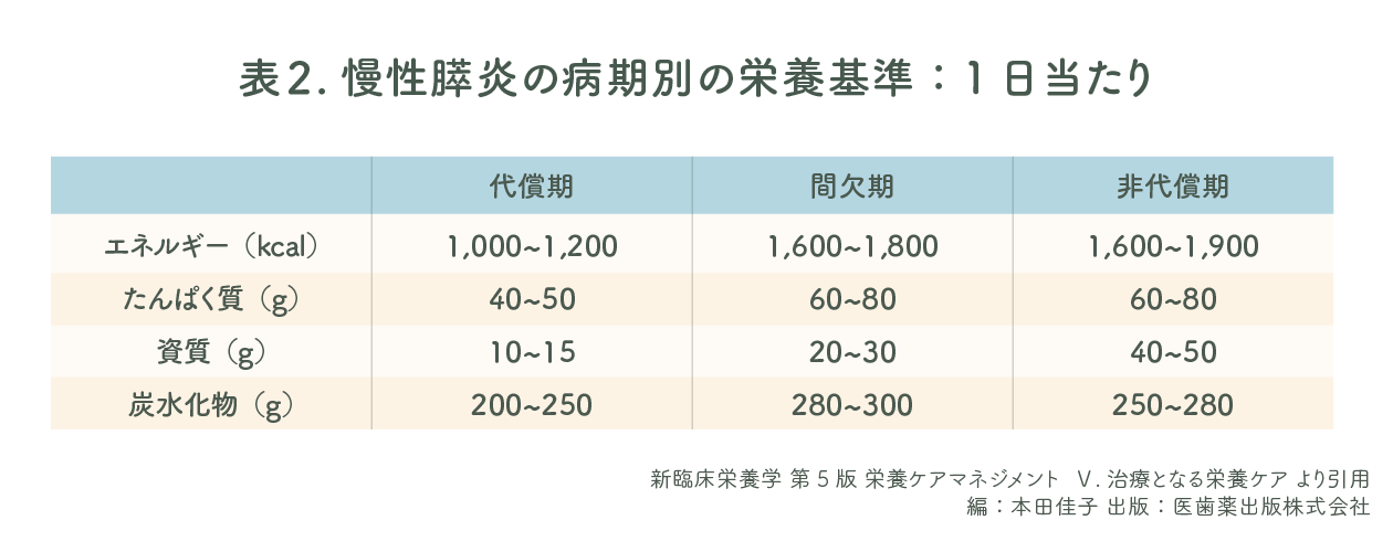 慢性膵炎の食事栄養管理は、病期ごとに変わります。基本栄養量は下記の通りです。
