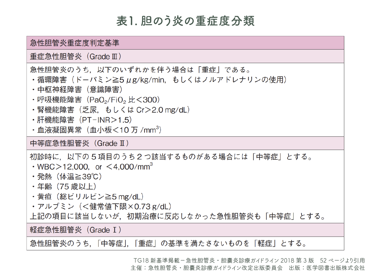 胆のう炎は表1の通り、以下のいずれかを伴う場合「中等症」 と診断されます。