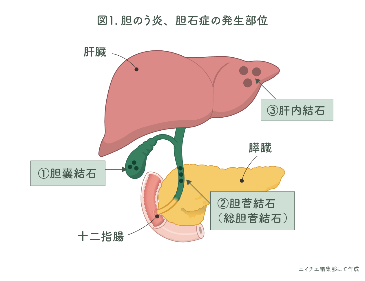 胆石とは、胆管系のどこかに石ができる病気のことをいいます。胆管系とは、肝臓で作られた胆汁を肝臓から腸(正確には十二指腸)に流す管組織の総称です。発生した石の所在部位により、胆のう結石、総胆管結石、肝内結石に分けられますが、なかでも最も頻度が高いのは胆のう結石です。