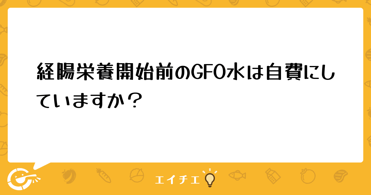 病院栄養士をしてます!みなさんのところでは、どうしているか教えて下さい!経腸栄養を開始する前にGFOを使用しています。うちの病院では、今のところ、自費としていますが、みなさんの施設はどうしていますか?参考にしたいので教えて下さい!