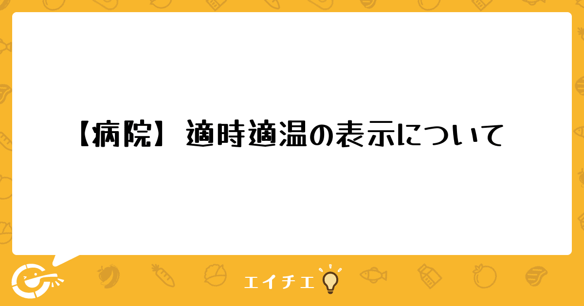 その際指摘された事項は「適時適温の表示がない」との事でした。恥ずかしながら、適時適温を表示する事を知らなかったため、監査員の方に聞き返したところ、患者様に対しての表示がないねとの事でした。その後、どのようにとか、内容をもう少し詳しく聞けば良かったと今更ながら後悔しております。病院に勤めている方など知っている方がいましたら、教えて頂きたいです。