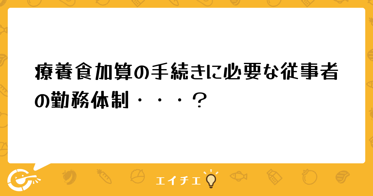 教えて頂きたいのですが、療養食加算を前任者がされておらず、本年度から行う予定でしたが、事務長より従事者の勤務体制及び勤務形態一覧表が必要とのことでした。調理は委託業者さんがされています。