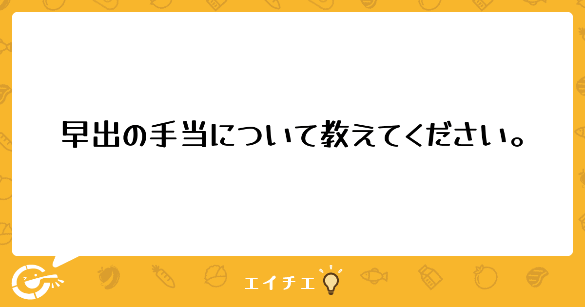 早出の手当について教えてください。今の医院では、朝6時からの勤務で1000円の手当が付きますが、皆さんの職場ではどのくらいですか。教えてください。