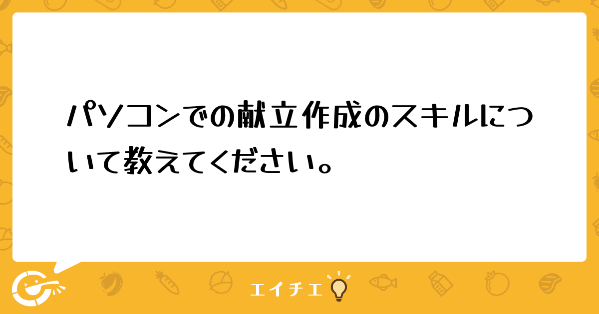 こんにちは。パソコンで献立作成のお仕事をしている方に教えてほしいことがあります。ただいま、パートのお仕事で職探しをしています。老人ホームで、食事作成と、パソコンによる献立作成のお仕事に、応募しようと思っています。パソコンでの献立作成は、未経験です。ただいま、パソコンスクールに通って、ワードとエクセルのスペシャリストとエキスパート取得を、目指しています。資格はないものの、書類を作ったり、エクセルにデータを入力したり、データを保存、印刷などはできますが、どのくらいのスキルが求められているのでしょうか?教えてください。