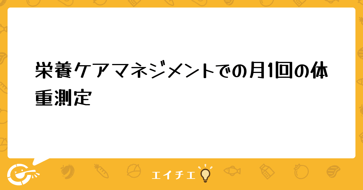 各病棟師長さんとドクターはそれでもよいとのことで栄養士さんはどうなのかと。人手不足の中毎月毎月本当に大変そうで・・・・。月に1回のモニタリングは体重以外に摂取量の確認、熱発の有無、褥瘡の治癒状態、皮膚の状態などでして体重は3ヶ月に1回でもいいかなぁと思っているのですが。でも栄養ケアマネジメントでは体重1ヶ月に1回と明記されています。ただ現実問題現場ではそれがかなり困難な様です。皆様の施設はきちんと1ヶ月に1回の測定をされているでしょうか?分かりにくい文章で申し訳ありませんがよろしくお願いします。