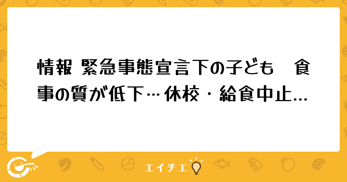 新型コロナウイルス感染症の流行は、緊急事態宣言下での休校・学校給食の中止などによって、子どもたちの食事の質にも大きな影響を与えていることが、国立成育医療研究センターと新潟県立大学の研究グループによる全国調査で明らかになった。