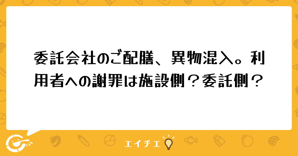 お疲れ様です。いつも参考にしています。入所100名デイ100名の老健で一人管理栄養士です。厨房は全委託です。提供後ご配膳、異物混入の連絡の際には栄養課として私が、謝罪に伺い詳細を確認して委託会社に伝える形をとっていたのですが、委託会社の栄養士あるいはチーフが謝罪に行ったほうが、意識的にしっかり受け止め改善策を考えるのでは、と思っています。ご配膳は、栄養課としての責任。と常に思っているので、まずは自分が状況確認とおもっています。頻繁にご配膳があるわけではなく、稀にあっても検品で分かる事がほぼですが、自分が休みの時などどのような対処が正しいのかと考えています。
