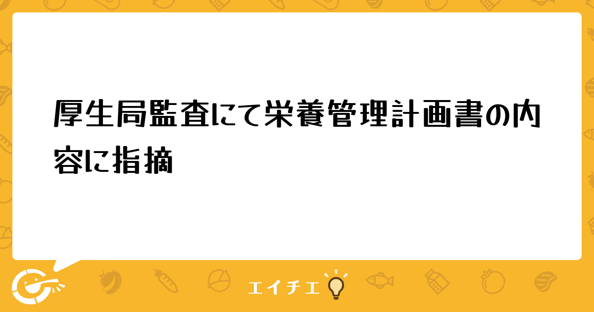 先日厚生局の適時調査がありました。給食管理の書類は自分が対応しましたが、栄養管理に関しては師長が対応しています。すると総評にて計画書の内容について指摘がありました。
