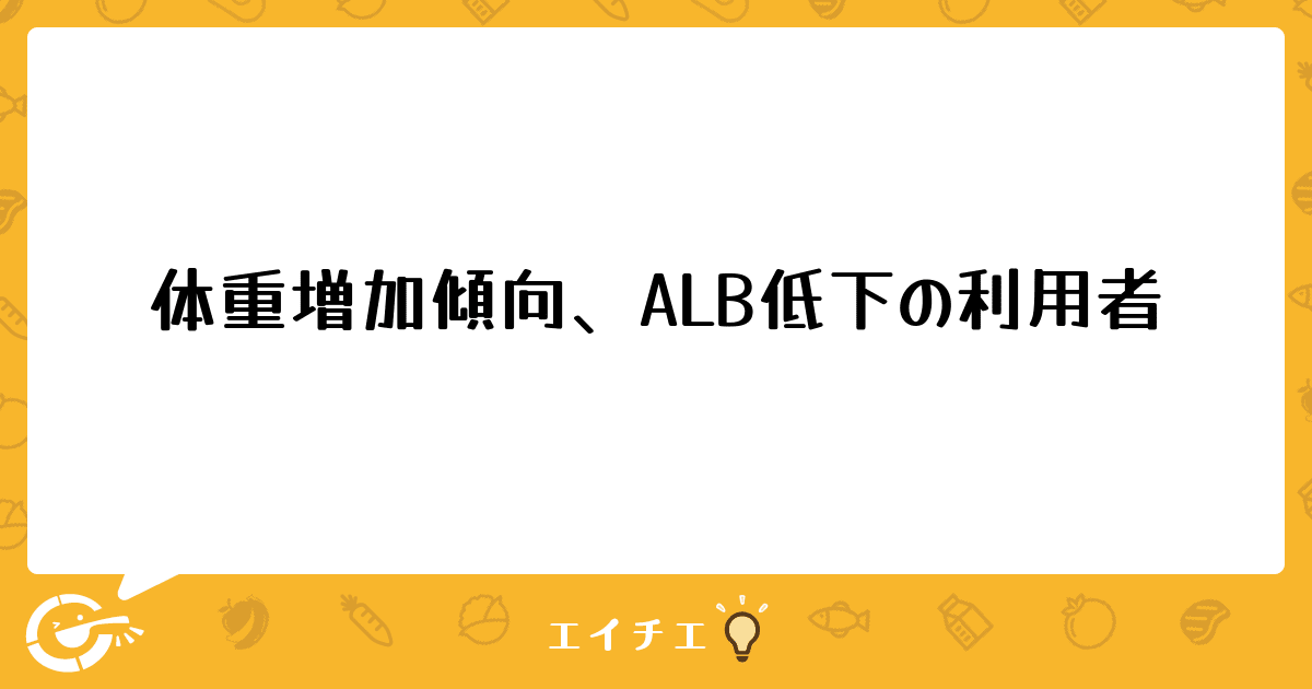 ある利用者で入所時、体重が多めでALB3.3でした。身体的負担から体重を減らしていきALBを3.6以上にしようという目標で行っています。3カ月後、体重は2Kg減りALB3.7まで上がりました。しかしそれから6カ月後、入所時と同じ体重にもどりALB3.4に下がりました。浮腫もなく、OTに聞いたら活動量も変わってないと。食事内容も変えていません。代謝とか関係しているのかもしれません。