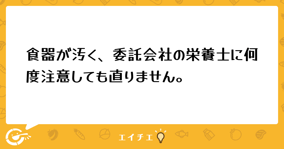 私は老人保健施設で働いている管理栄養士です。今回の相談は汚れて食器、コップを出されることです。厨房は委託会社が入っています。ここ最近、汚れが残っている食器が多くあります。例えば、ジュースを入れるコップなどには牛乳の膜やとろみが固まったものを渡されることがあります。利用者様に出す前に職員が気付き厨房に注意するのですが、このような事が多々あります。給食会議にもこの事を伝え「食器をきれいに出す事は当たり前の事なので今後このようなことがないようにして欲しいとまた食中毒などの原因になるので洗浄して欲しい」と伝えました。委託会社からは人員不足も原因なのですぐに人員を増やし、利用者様に出す前に絶対確認してから食器を出しますと言いましたが、会議の1週間後にまたありました。また、同じように注意しましたが委託会社の人員が少ないやパートさんがちゃんとしてくれないからと言い訳しか言ってくれません。そして次は絶対にないようにします。といつも言いその1週間後にはまた汚いコップがあるなど同じ事を繰り返しです。汚れたコップなどはすぐに厨房に渡さず、委託会社の本社の方々が来た際に証拠として見せています。厨房の栄養士の方に言ってもパートさんにせいにしかしないため、部長に委託会社の本社の方に注意してもらいました。しかし、返ってきた答えは人員を増やしますなどといつもと同じ答えです。また絶対に委託会社の栄養士か調理師のチーフにきれいか確認してから食器やコップを出すと委託会社の上の方々が約束しました。しかし昨日また固まったとろみのついたコップを出されました。この事を厨房に伝えると、「絶対確認すると本社の方が言ったが調理の時間に追われて全部は確認できないから」と厨房の調理師のチーフに言われました。私は「前に約束したことと違うし利用者様にはきれいな食器で食事を提供して欲しい。本社と現場の意見が異なってたら、こっちはどうしたら良いか分からないので現場で実践できる方法を本社と話しあってから施設側に言って欲しい。施設側は利用者様にただきれいな食器で食事を食べて欲しいと当たり前の事をお願いしているだけです」と伝え厨房を去りました。