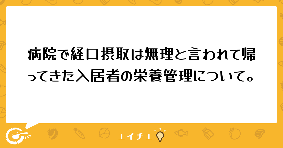 経口摂取は、無理だと言われて病院では点滴で栄養をとっていた方がいまして、その方の栄養管理について相談です。その方の家族様は、うちの施設では経口摂取以外の栄養補給はできないと知ったうえで、戻られてきました。